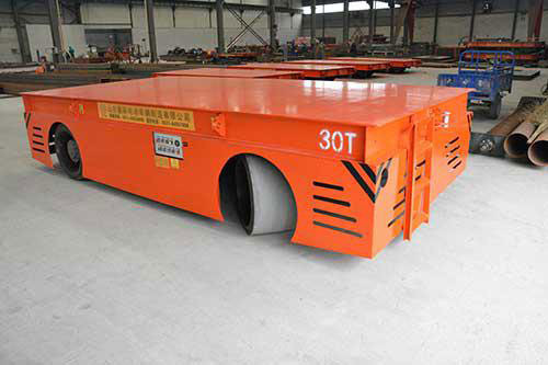 Trackless transfer cart with the high capacity and quality is an alternative transfer cart. It overcomes many inconveniences of rail-type electric transfer carts. The trackless electric transfer carts can finish free-turning without the rail in the workshop. There is no need to lay rails, so it does not affect traffic, does not hinder production, and the flat car is more flexible, the operation is more humanized. It not only could run on the straight line, L-form track but also could run on the curved track. We can make different shape cart to meet various client's needs.